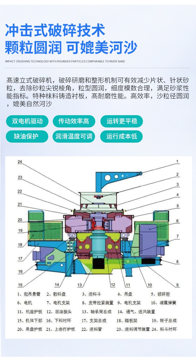 一、精品制砂理念 高速立式破碎機(jī),破碎研磨和整形機(jī)制可有效減少片狀、針狀砂粒,去除砂粒尖銳棱角,粒型圓潤,細(xì)度模數(shù)合理,滿足砂漿性能指標(biāo)。特種材料鑄造襯板,高耐磨性能。破碎機(jī),粒徑圓潤,媲美自然河沙。