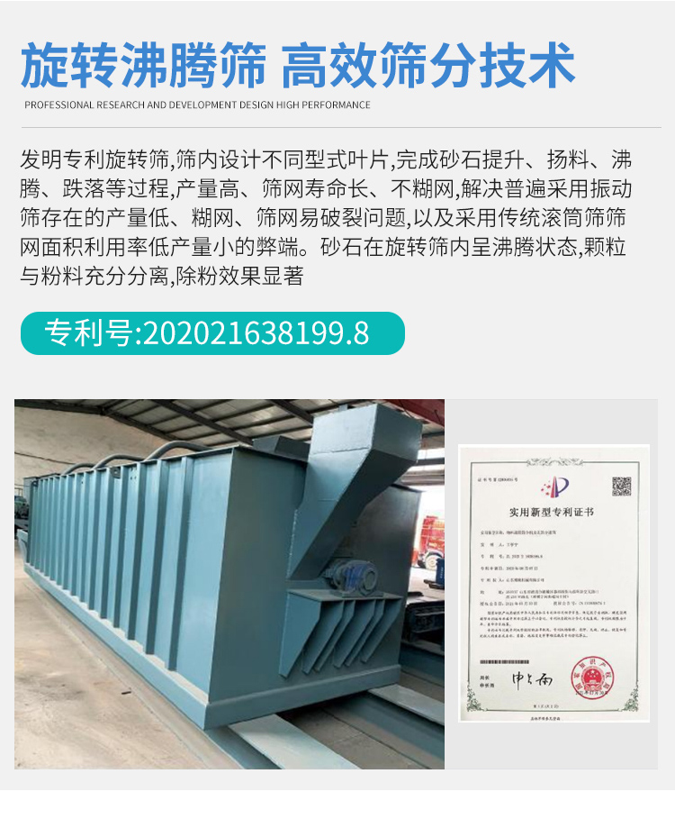 二、旋轉(zhuǎn)篩性能優(yōu)越 發(fā)明專利旋轉(zhuǎn)篩,篩內(nèi)設(shè)計(jì)不同型式葉片,完成砂石提升、揚(yáng)料、沸騰、跌落等過程,產(chǎn)量高、篩網(wǎng)壽命長、不糊網(wǎng),解決普遍采用振動(dòng)篩存在的產(chǎn)量低、糊網(wǎng)、篩網(wǎng)易破裂問題,以及采用傳統(tǒng)滾筒篩篩網(wǎng)面積利用率低產(chǎn)量小的弊端。砂石在旋轉(zhuǎn)篩內(nèi)呈沸騰狀態(tài),顆粒與粉料充分分離,除粉效果顯著。