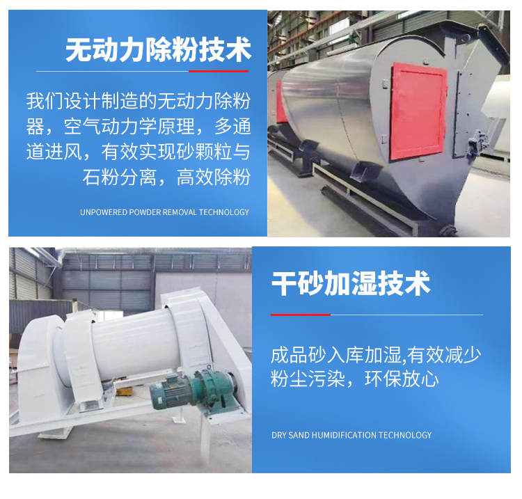 五、有效除粉 無重力除粉系統(tǒng),有效除粉,成品砂中粉含量達(dá)標(biāo)。除塵器與除粉倉組合設(shè)計(jì),下部粉料散裝機(jī),方便石粉的運(yùn)輸。